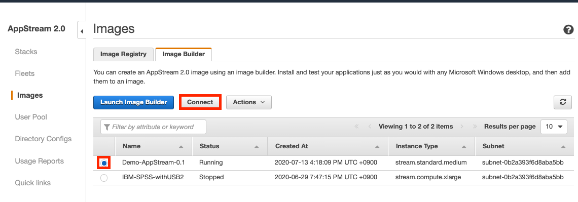 Running 상태일때 Image Builder를 선택하고 "Action" --> "Connect"을 클릭합니다.