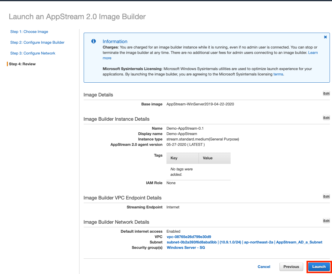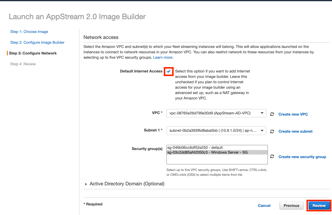 - VPC : Default (저는 AppStream 전용 VPC가 있어 그쪽으로 했습니다!)