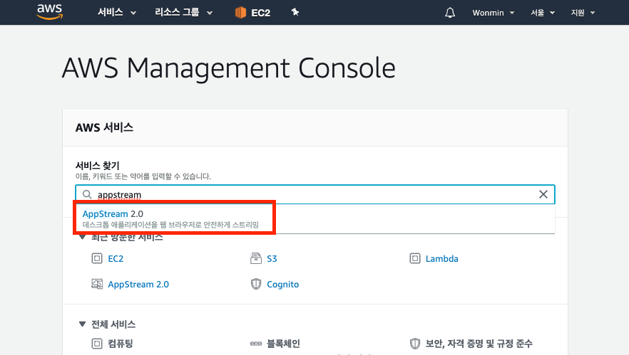 aws.amazon.com 로그인 후 AppStream 2.0 서비스를 검색하여 AppStream 2.0 콘솔에 접속합니다.