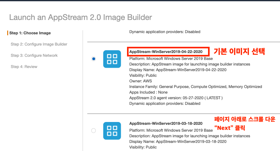 저는 가장 기본인 "AppStream-WinServer2019" 이미지를 선택했습니다. 선택 후 페이지 스크롤 다운 하여 "Next"를 클릭해주세요.