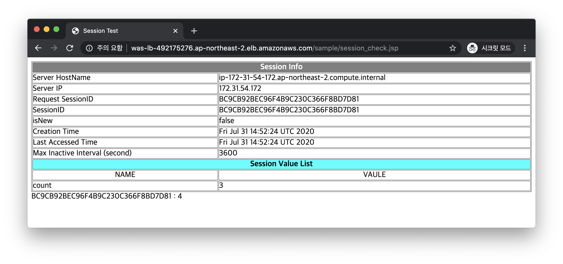 크롬 시크릿창에서 ELB경로/sample/tomcat_session_test.jsp 확인
