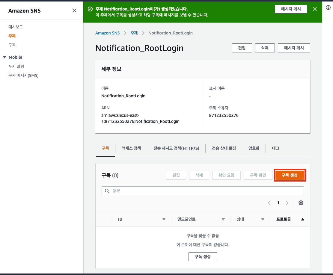 주제(Notification_RootLogin)이 정상적으로 생성되었습니다. 이제 이 주제를 구독하도록 새로운 구독을 생성합니다.