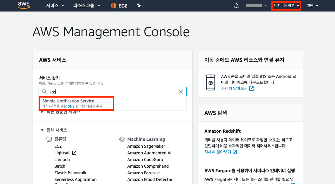 이번 단계에서는 Amazon SNS (simple notification service)를 이용하여 e-mail 을 발송할 수 있도록 설정하겠습니다.